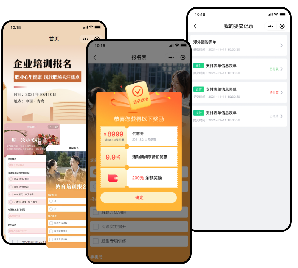 除了使用系统提供的表单模板外,还可以进行拖拽式布局装修,进行个性化的细节设置