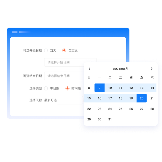 支持通过日历选择一段时间,目前天数的计算方式有2种:当天/跨天。当天模式即1号-7号等于7天,跨天模式即1号-7号等于6天