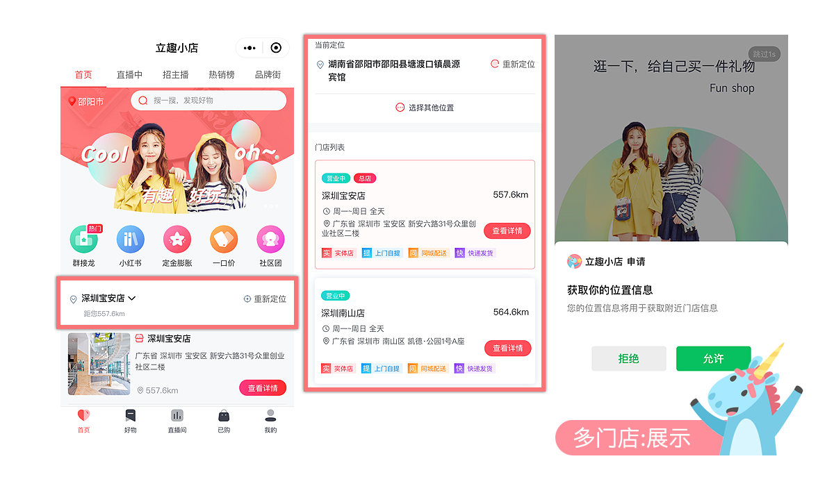 买家:根据所在位置推荐附近门店,门店列表自由切换,也可根据自身需求选择其他区域的门店