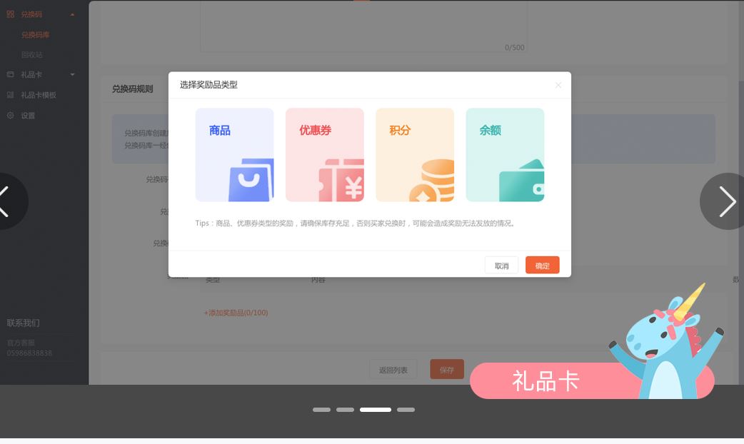 一键生成兑换码,同时支持礼品卡包含余额、商品、积分、优惠券