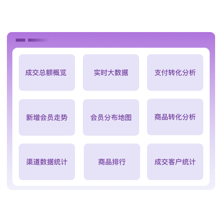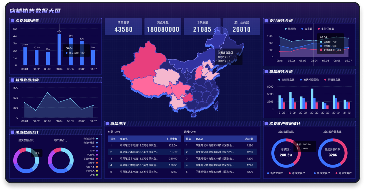 包含多个数据板块:成交总额概览、新增会员走势、渠道数据统计、商品排行、支付转化分析、商品转化分析、成交客户数据统计等