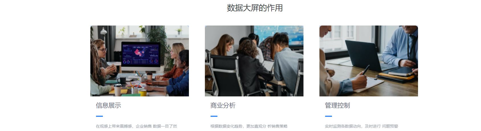通过各类可视图表、实时数值、实时榜单等来表现数据的变化趋势、对比、关联、变量等信息,视觉效果更直观