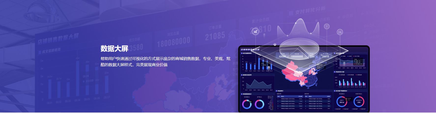大屏展示样式由专业设计师打造,用户可在后台手动修改展示数据,3分钟即可快速完成数据大屏搭建