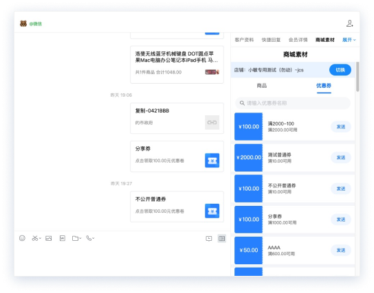 支持在于会员聊天时发送优惠卷,会员点击即可一键领取优惠卷