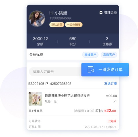 支持在企业微信查看客户在小程序商城中的会员信息,并一键发送订单