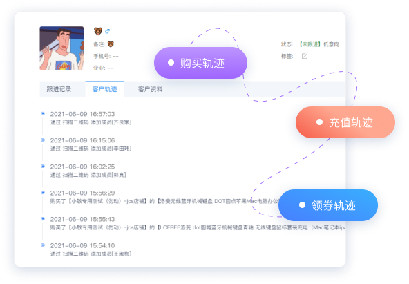 支持在企业微信查看客户在小程序店铺中的购买、充值、领卷等行为轨迹